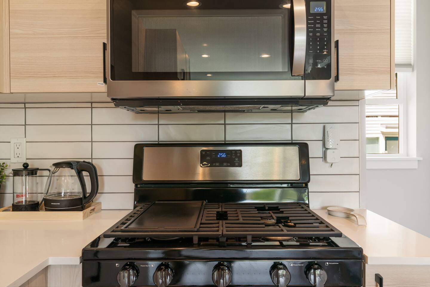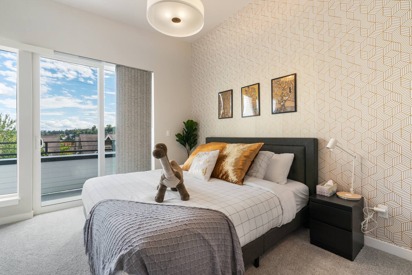 This brand-new one-bedroom apartment is a private oasis just 9 minutes from downtown Seattle and 7 minutes to Lumen Field. Enjoy a spacious living area, balcony, rooftop deck with Mt. Rainier views, a fully equipped kitchen, and a dedicated remote work station. Free street parking is available. This upscale retreat offers comfort, style, and a prime location.
