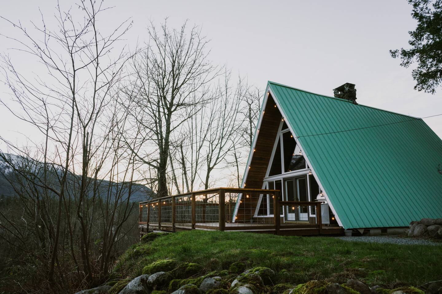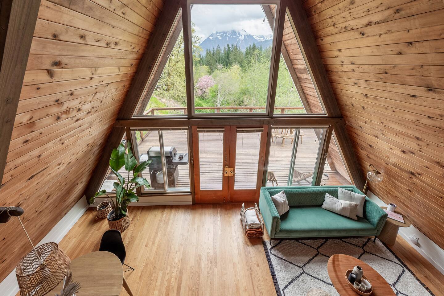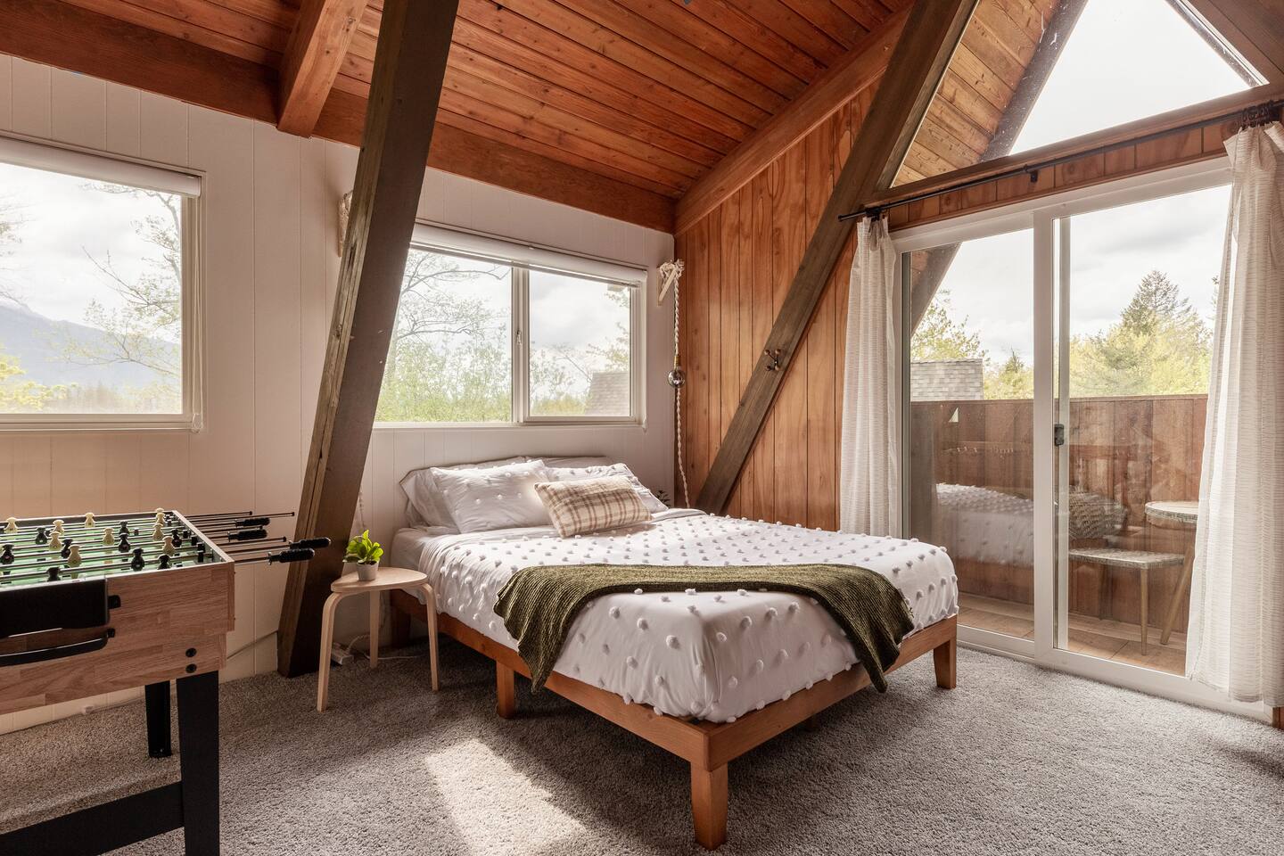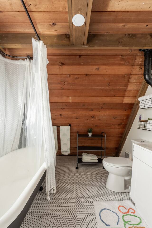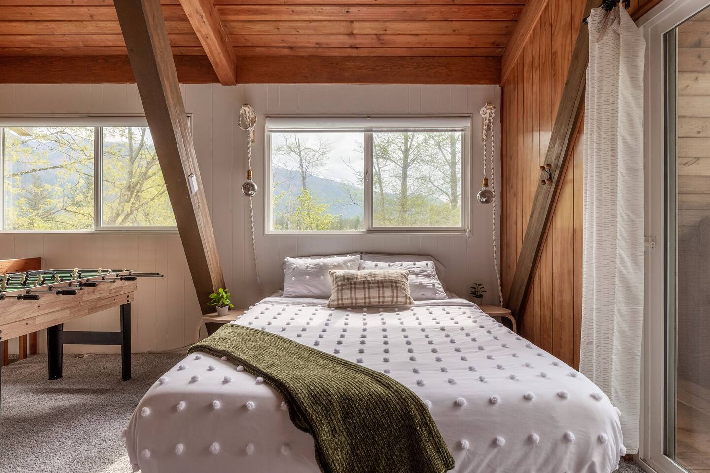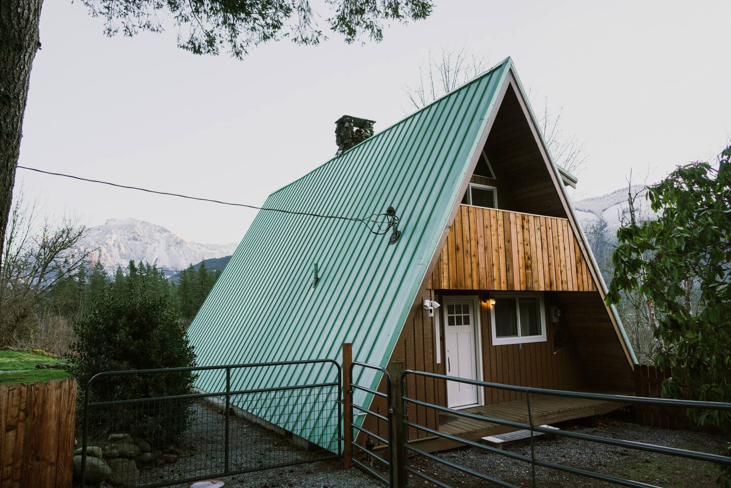 The cabin accommodates up to four adults and features two queen-sized beds, luxurious foam mattresses, and cloud-like duvets. Snuggle up in front of the gas fireplace and stream your favorite movie on the Roku Smart TV, or unwind with your favorite book in the clawfoot tub after an adventure-filled day—your feet will thank you! Finish off the evening with a home-cooked meal in the well-appointed & fully equipped kitchen. If the weather permits, be sure to enjoy a cup of evening tea on the front deck, where you’ll appreciate the abundance of mountain fresh air. The deck comes complete with an outdoor fire pit, well-maintained grill & dining area, surrounded by gorgeous mountains. If staying cozy is more your speed, you’ll be taken care of just the same. Sit back with a glass of mulled wine and soak up the rejuvenation that comes standard with the PNW A-Frame. Watch the light show stream through the windows as the sun catches the mountain peeks at Golden Hour each evening. Don’t feel like cooking? No problem! The cabin is close to several charming restaurants such as Maggy’s Family Mexican and Mountain View Diner. If you’re up for a little friendly competition, you’ll find a foosball table and several board games to keep the whole family entertained. Whether you’ve come for an adventure-packed getaway, or for some much-needed restoration, you’ll be in good hands with the PNW A-Frame.