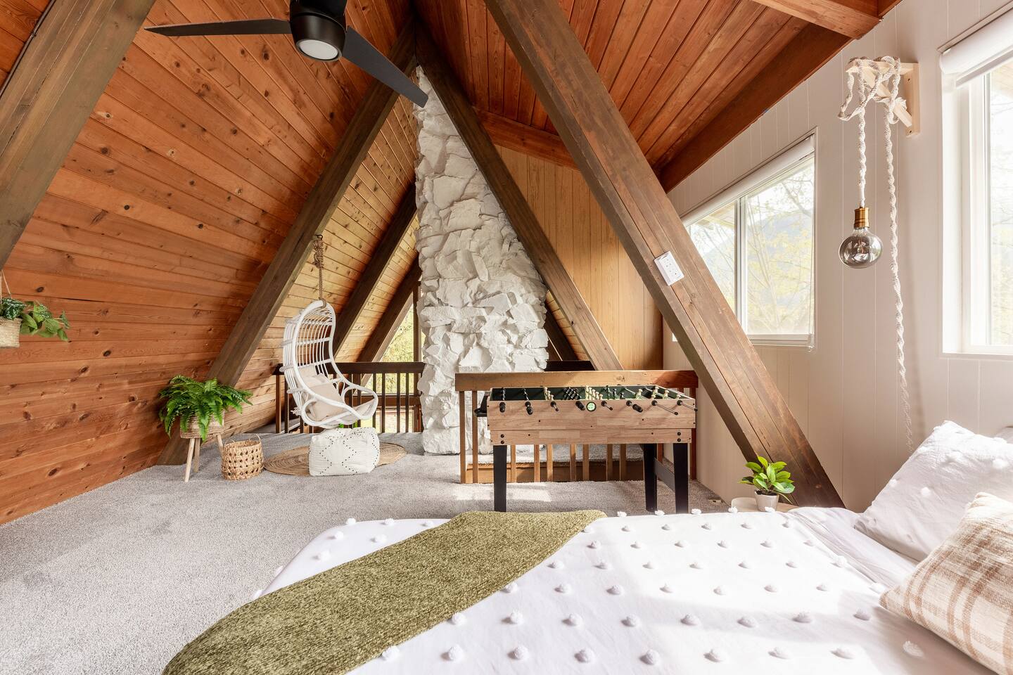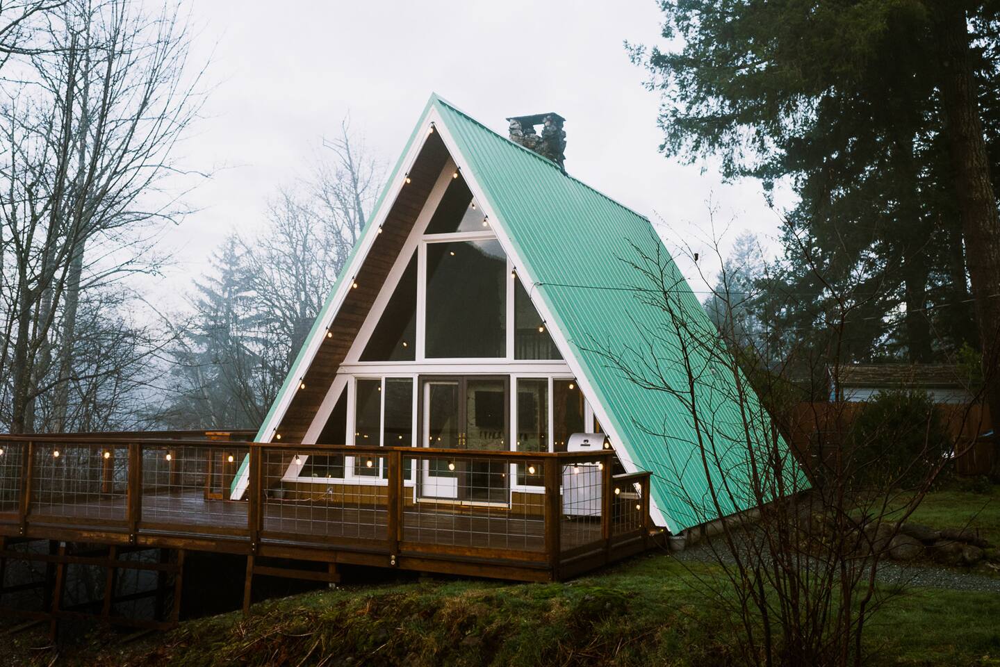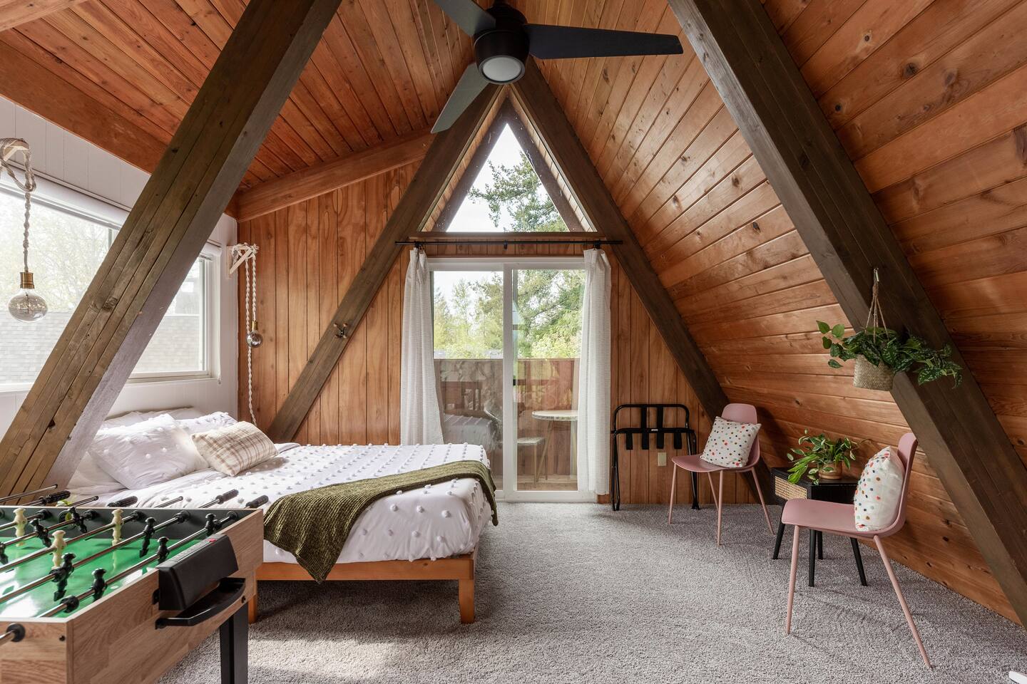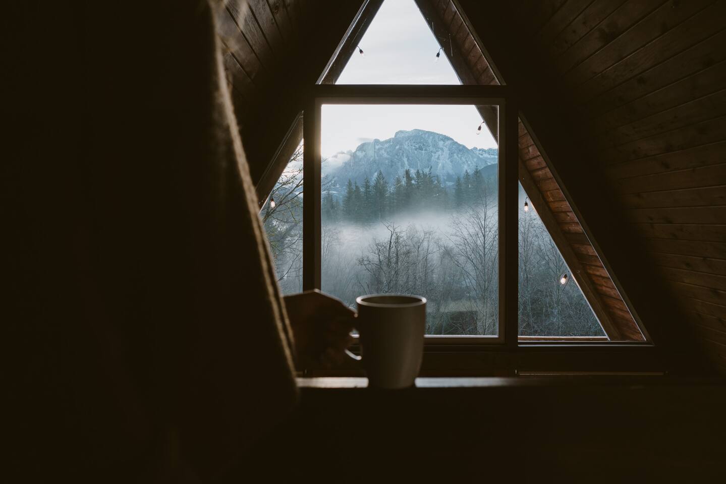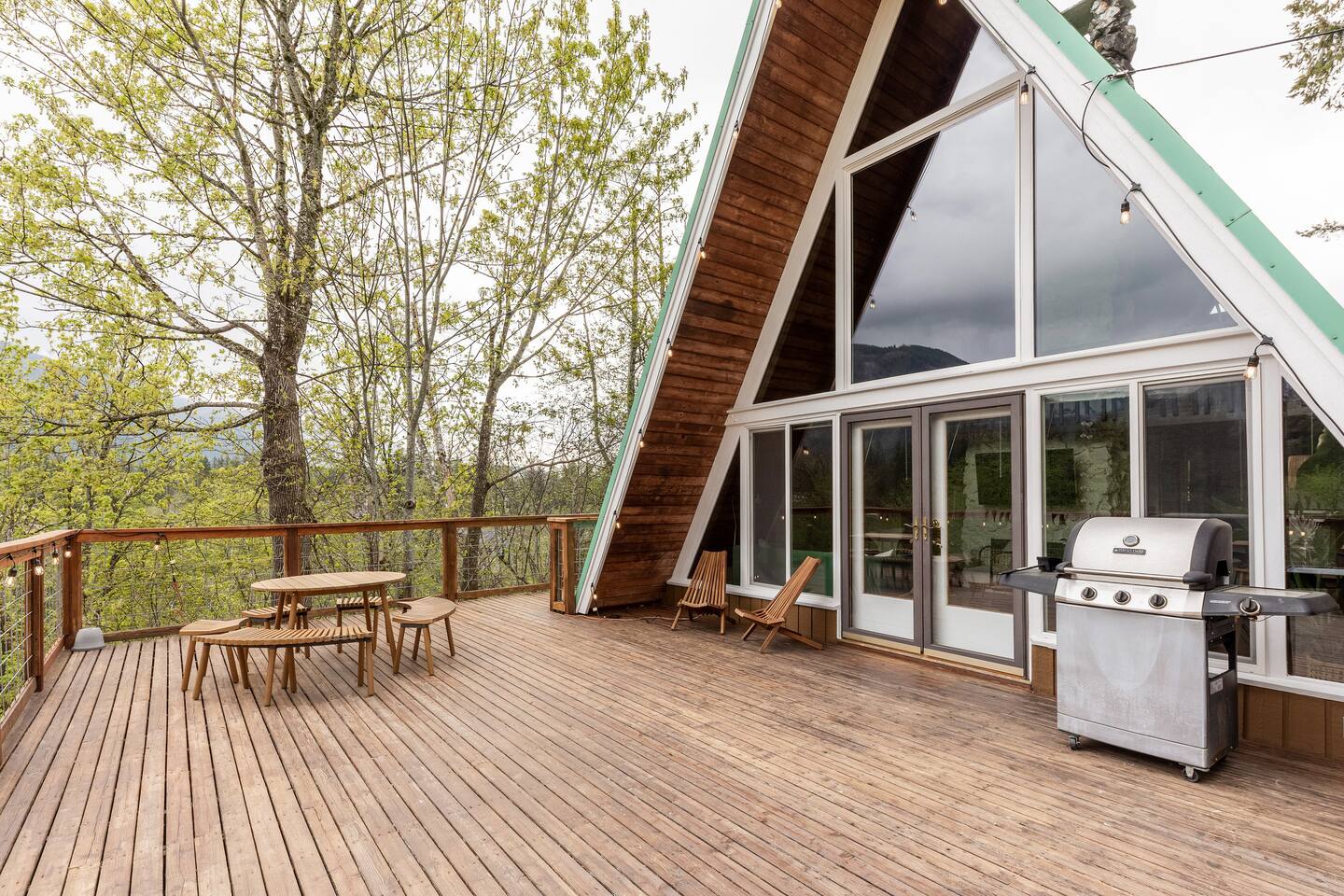 The cabin accommodates up to four adults and features two queen-sized beds, luxurious foam mattresses, and cloud-like duvets. Snuggle up in front of the gas fireplace and stream your favorite movie on the Roku Smart TV, or unwind with your favorite book in the clawfoot tub after an adventure-filled day—your feet will thank you! Finish off the evening with a home-cooked meal in the well-appointed & fully equipped kitchen. If the weather permits, be sure to enjoy a cup of evening tea on the front deck, where you’ll appreciate the abundance of mountain fresh air. The deck comes complete with an outdoor fire pit, well-maintained grill & dining area, surrounded by gorgeous mountains. If staying cozy is more your speed, you’ll be taken care of just the same. Sit back with a glass of mulled wine and soak up the rejuvenation that comes standard with the PNW A-Frame. Watch the light show stream through the windows as the sun catches the mountain peeks at Golden Hour each evening. Don’t feel like cooking? No problem! The cabin is close to several charming restaurants such as Maggy’s Family Mexican and Mountain View Diner. If you’re up for a little friendly competition, you’ll find a foosball table and several board games to keep the whole family entertained. Whether you’ve come for an adventure-packed getaway, or for some much-needed restoration, you’ll be in good hands with the PNW A-Frame.