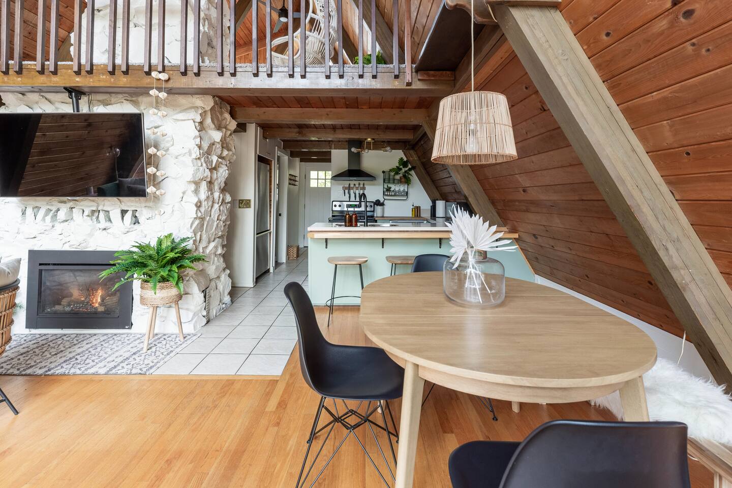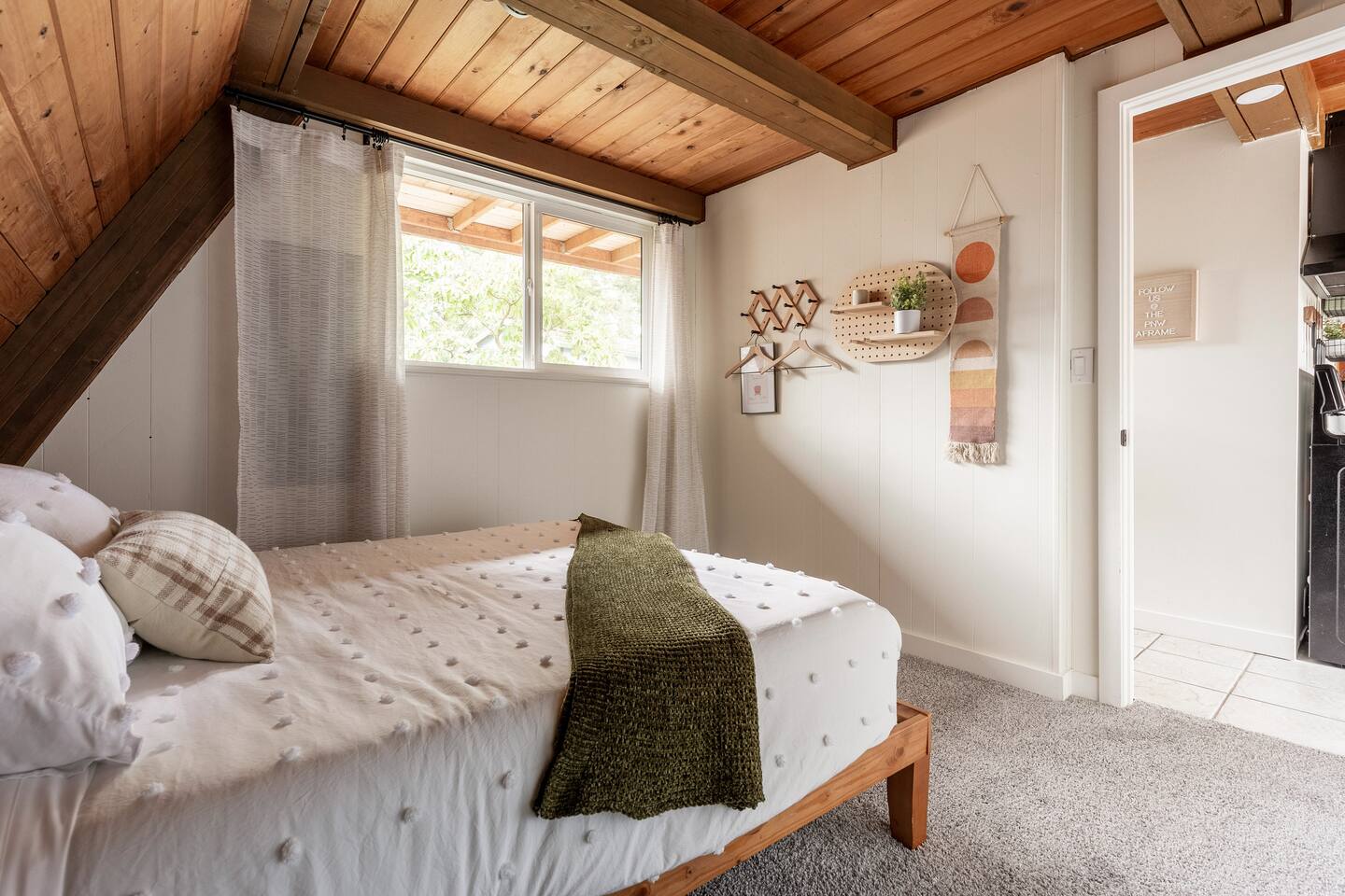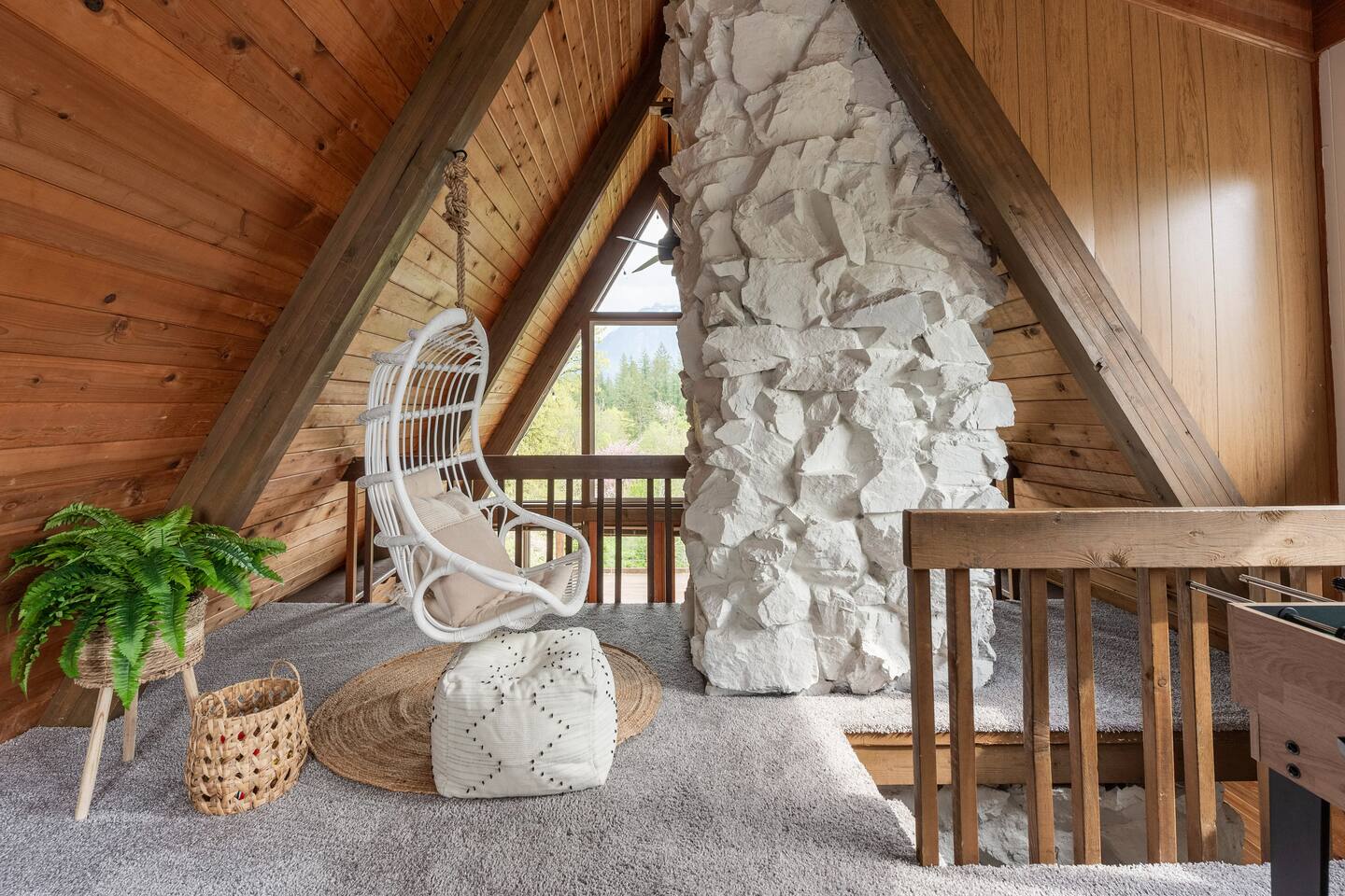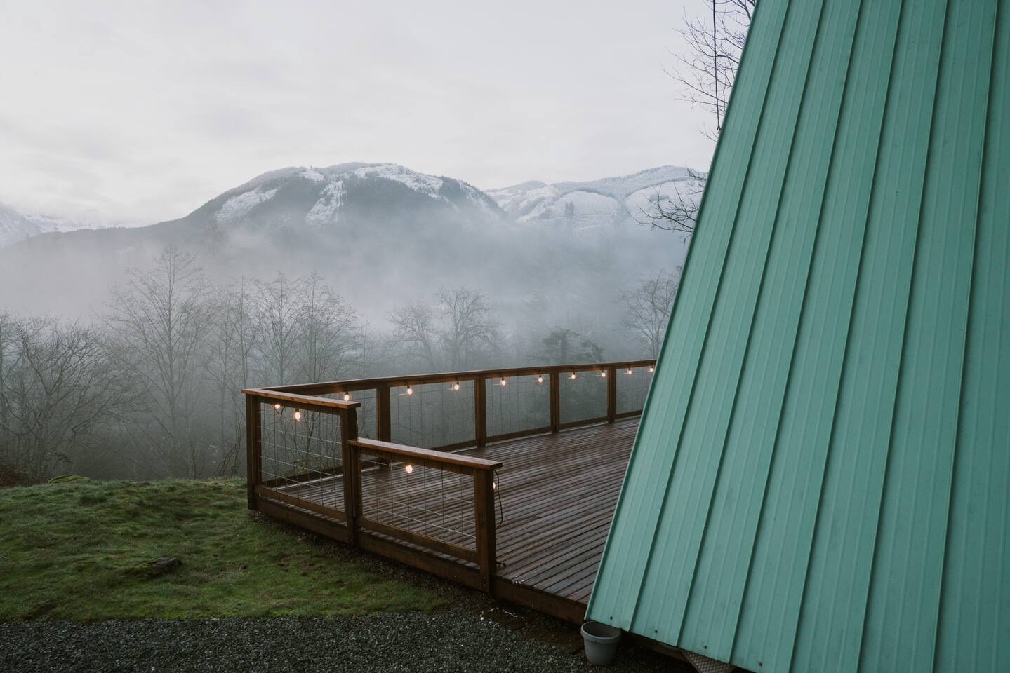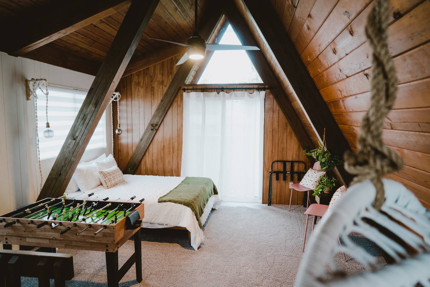 The cabin accommodates up to four adults and features two queen-sized beds, luxurious foam mattresses, and cloud-like duvets. Snuggle up in front of the gas fireplace and stream your favorite movie on the Roku Smart TV, or unwind with your favorite book in the clawfoot tub after an adventure-filled day—your feet will thank you! Finish off the evening with a home-cooked meal in the well-appointed & fully equipped kitchen. If the weather permits, be sure to enjoy a cup of evening tea on the front deck, where you’ll appreciate the abundance of mountain fresh air. The deck comes complete with an outdoor fire pit, well-maintained grill & dining area, surrounded by gorgeous mountains. If staying cozy is more your speed, you’ll be taken care of just the same. Sit back with a glass of mulled wine and soak up the rejuvenation that comes standard with the PNW A-Frame. Watch the light show stream through the windows as the sun catches the mountain peeks at Golden Hour each evening. Don’t feel like cooking? No problem! The cabin is close to several charming restaurants such as Maggy’s Family Mexican and Mountain View Diner. If you’re up for a little friendly competition, you’ll find a foosball table and several board games to keep the whole family entertained. Whether you’ve come for an adventure-packed getaway, or for some much-needed restoration, you’ll be in good hands with the PNW A-Frame.