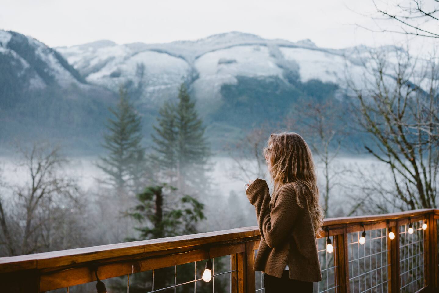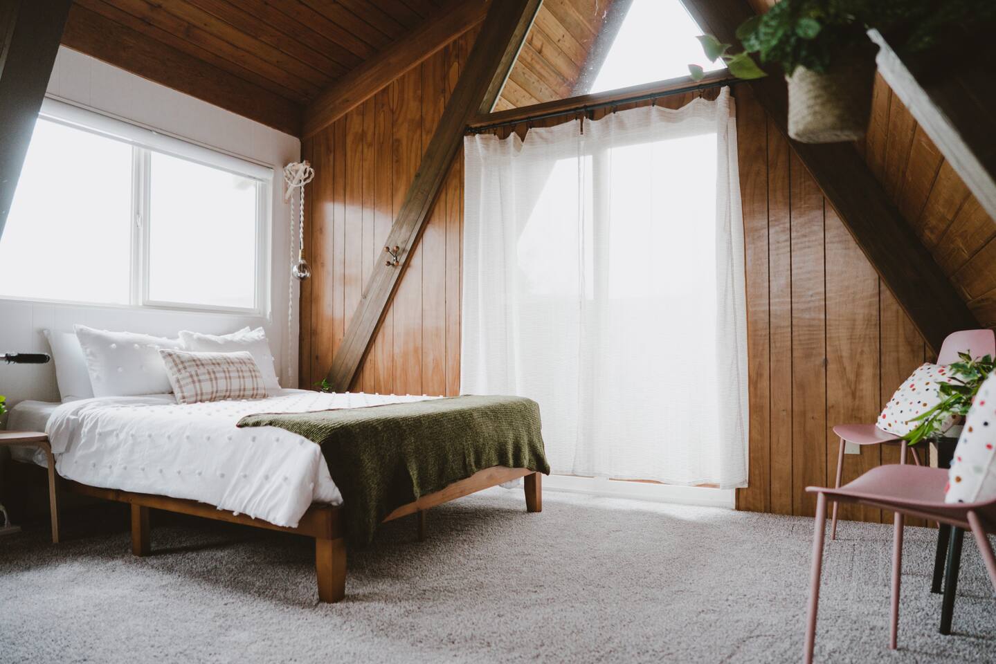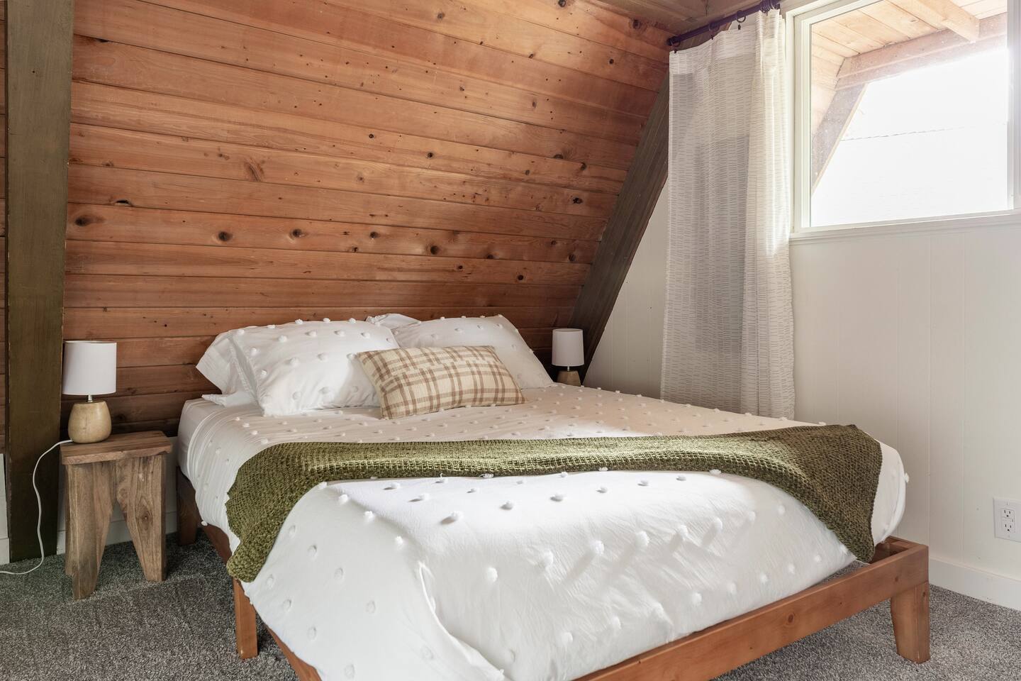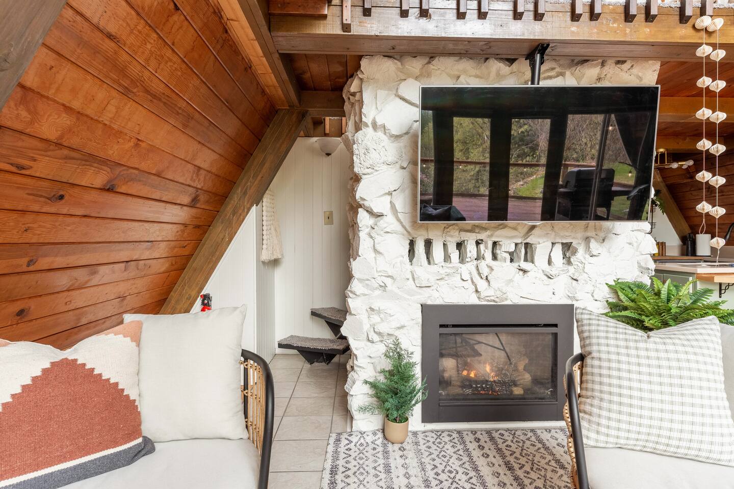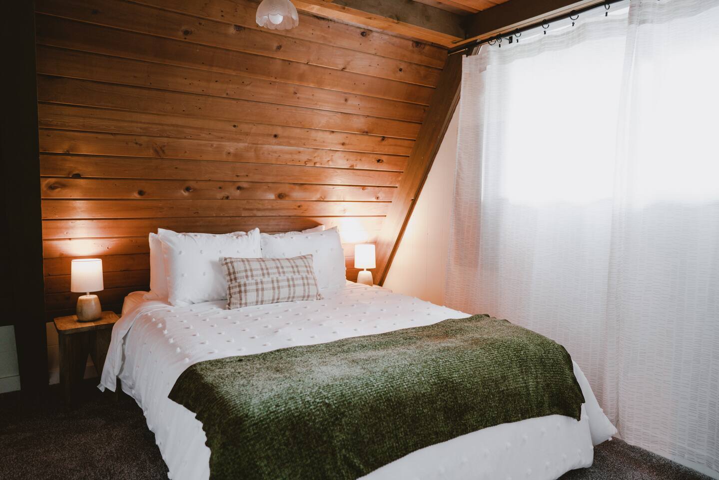 The cabin accommodates up to four adults and features two queen-sized beds, luxurious foam mattresses, and cloud-like duvets. Snuggle up in front of the gas fireplace and stream your favorite movie on the Roku Smart TV, or unwind with your favorite book in the clawfoot tub after an adventure-filled day—your feet will thank you! Finish off the evening with a home-cooked meal in the well-appointed & fully equipped kitchen. If the weather permits, be sure to enjoy a cup of evening tea on the front deck, where you’ll appreciate the abundance of mountain fresh air. The deck comes complete with an outdoor fire pit, well-maintained grill & dining area, surrounded by gorgeous mountains. If staying cozy is more your speed, you’ll be taken care of just the same. Sit back with a glass of mulled wine and soak up the rejuvenation that comes standard with the PNW A-Frame. Watch the light show stream through the windows as the sun catches the mountain peeks at Golden Hour each evening. Don’t feel like cooking? No problem! The cabin is close to several charming restaurants such as Maggy’s Family Mexican and Mountain View Diner. If you’re up for a little friendly competition, you’ll find a foosball table and several board games to keep the whole family entertained. Whether you’ve come for an adventure-packed getaway, or for some much-needed restoration, you’ll be in good hands with the PNW A-Frame.