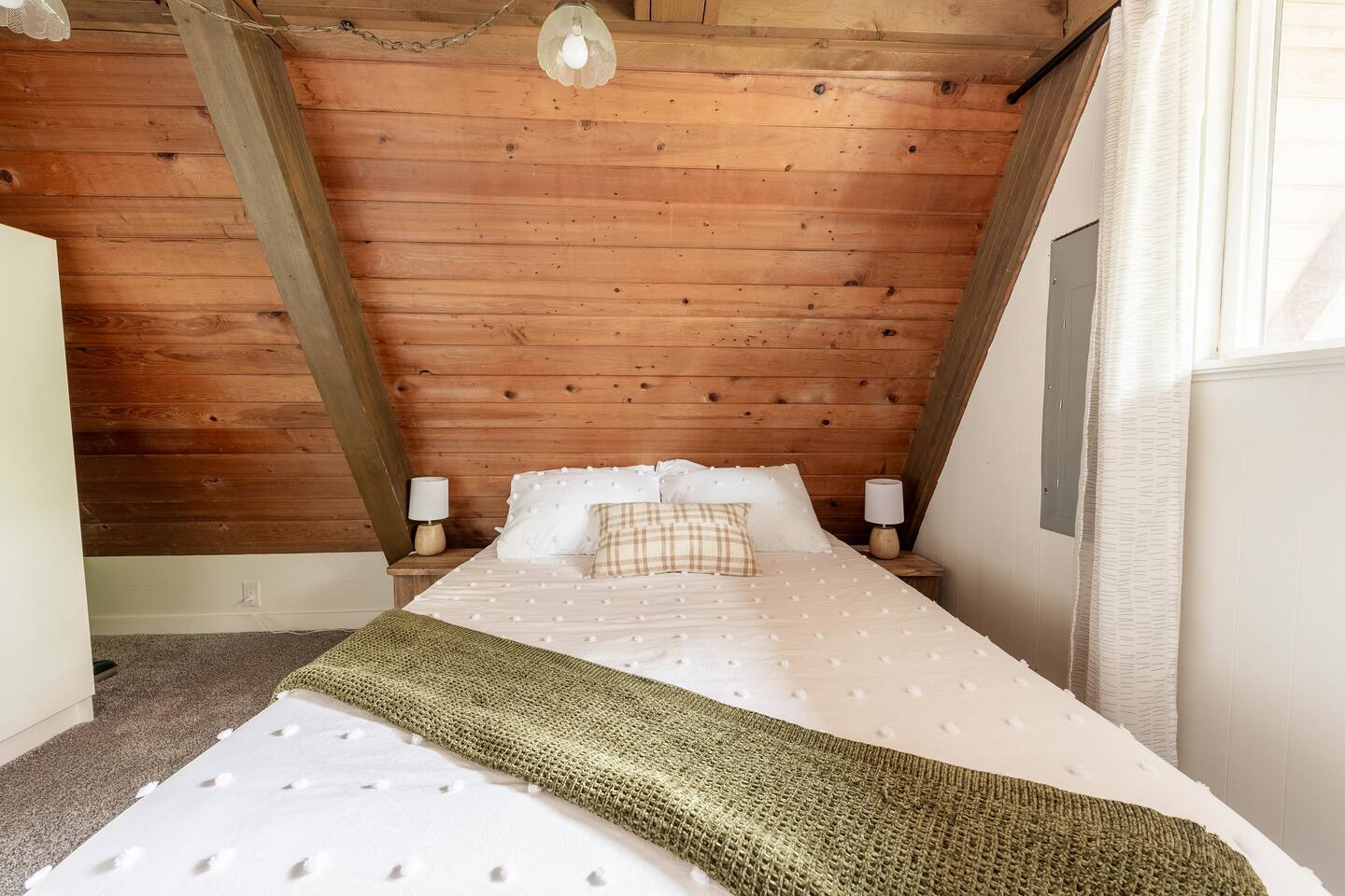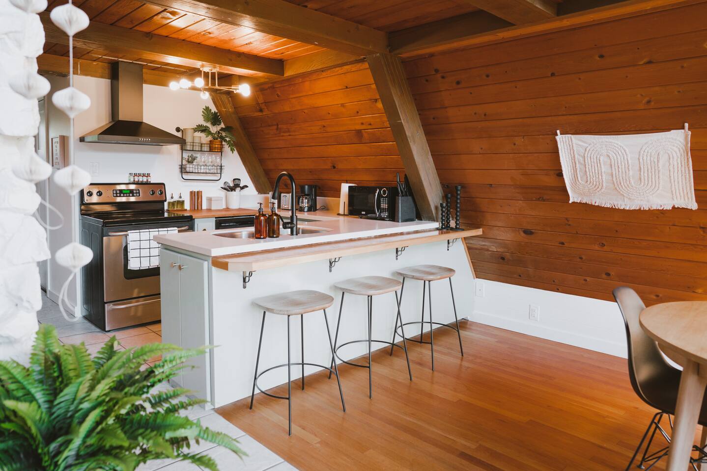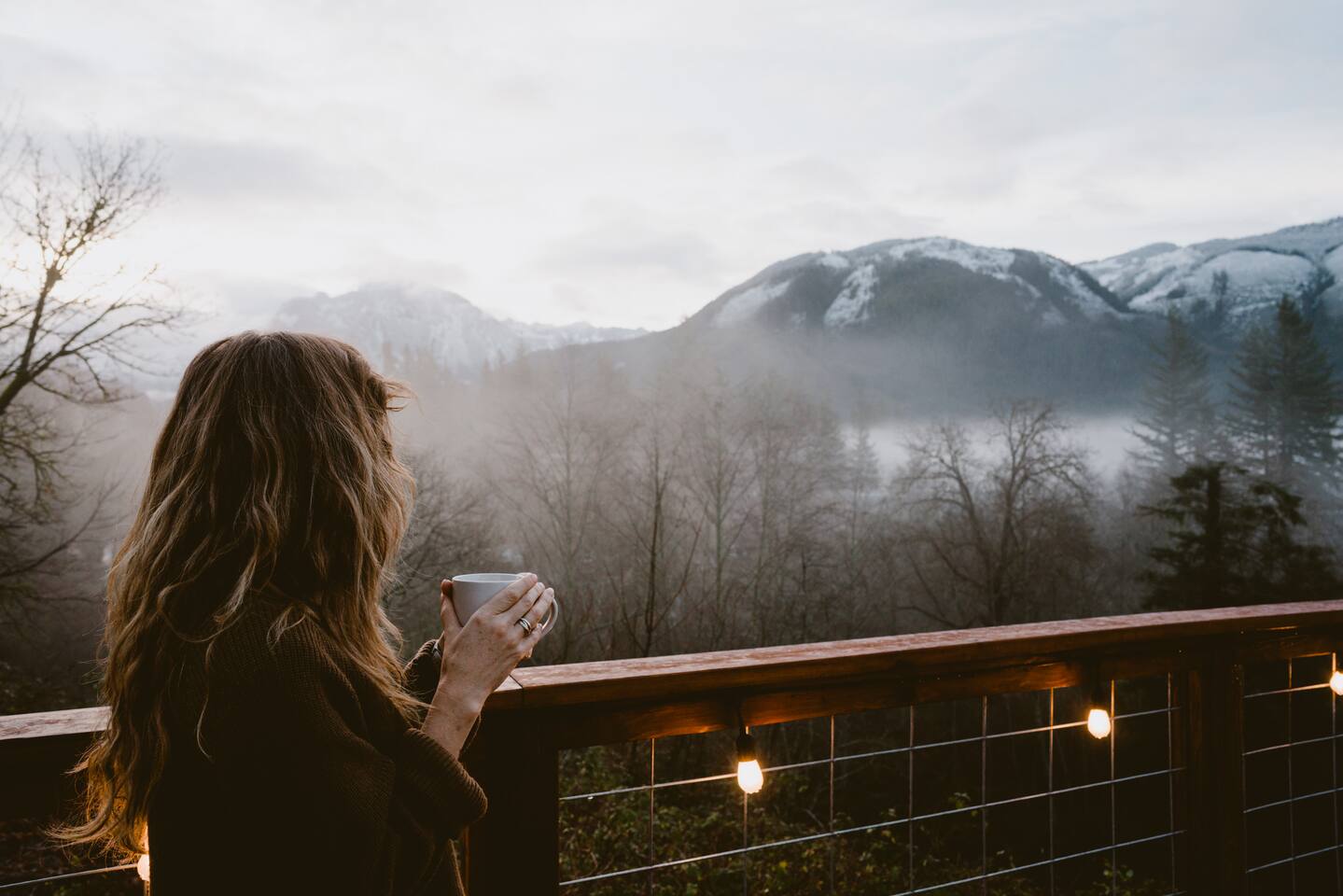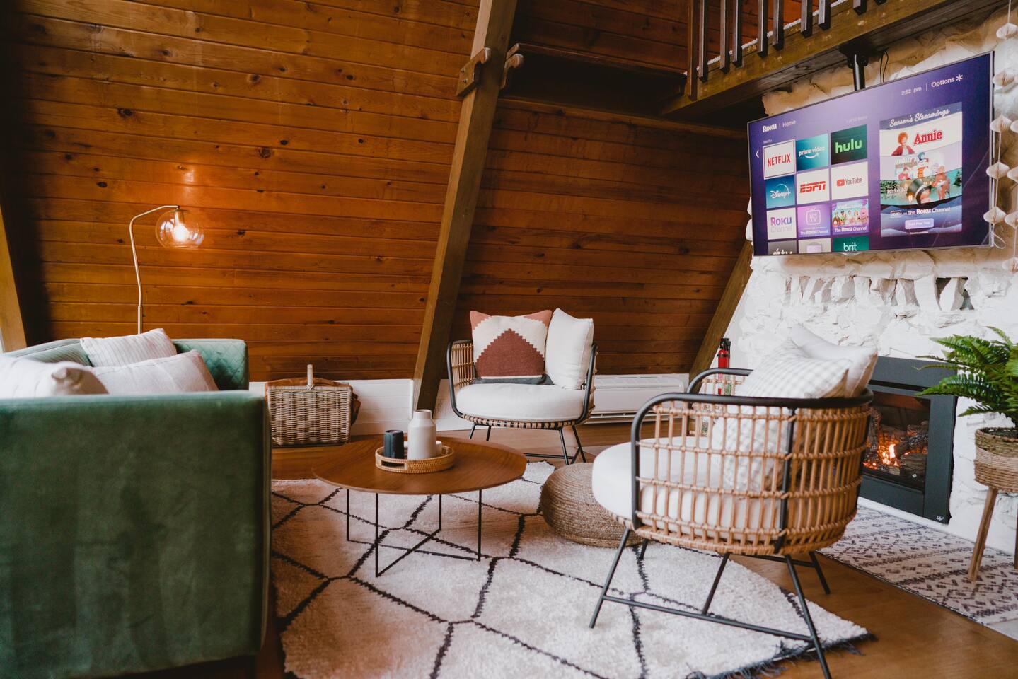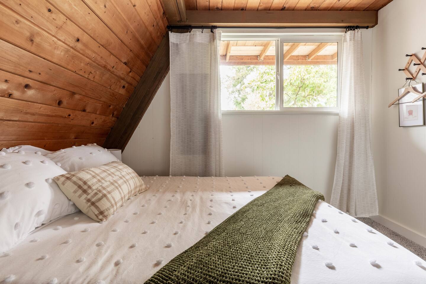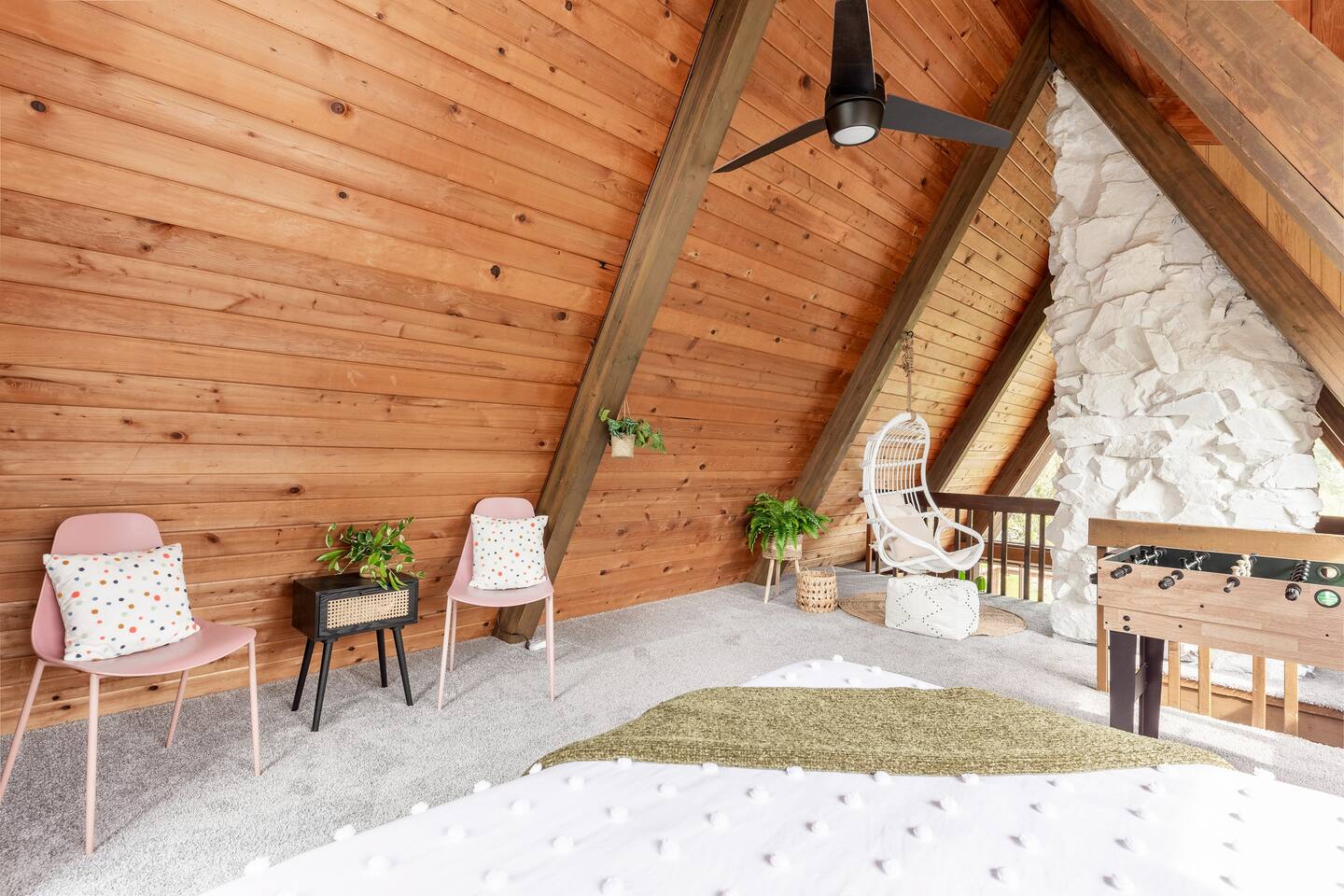 The cabin accommodates up to four adults and features two queen-sized beds, luxurious foam mattresses, and cloud-like duvets. Snuggle up in front of the gas fireplace and stream your favorite movie on the Roku Smart TV, or unwind with your favorite book in the clawfoot tub after an adventure-filled day—your feet will thank you! Finish off the evening with a home-cooked meal in the well-appointed & fully equipped kitchen. If the weather permits, be sure to enjoy a cup of evening tea on the front deck, where you’ll appreciate the abundance of mountain fresh air. The deck comes complete with an outdoor fire pit, well-maintained grill & dining area, surrounded by gorgeous mountains. If staying cozy is more your speed, you’ll be taken care of just the same. Sit back with a glass of mulled wine and soak up the rejuvenation that comes standard with the PNW A-Frame. Watch the light show stream through the windows as the sun catches the mountain peeks at Golden Hour each evening. Don’t feel like cooking? No problem! The cabin is close to several charming restaurants such as Maggy’s Family Mexican and Mountain View Diner. If you’re up for a little friendly competition, you’ll find a foosball table and several board games to keep the whole family entertained. Whether you’ve come for an adventure-packed getaway, or for some much-needed restoration, you’ll be in good hands with the PNW A-Frame.