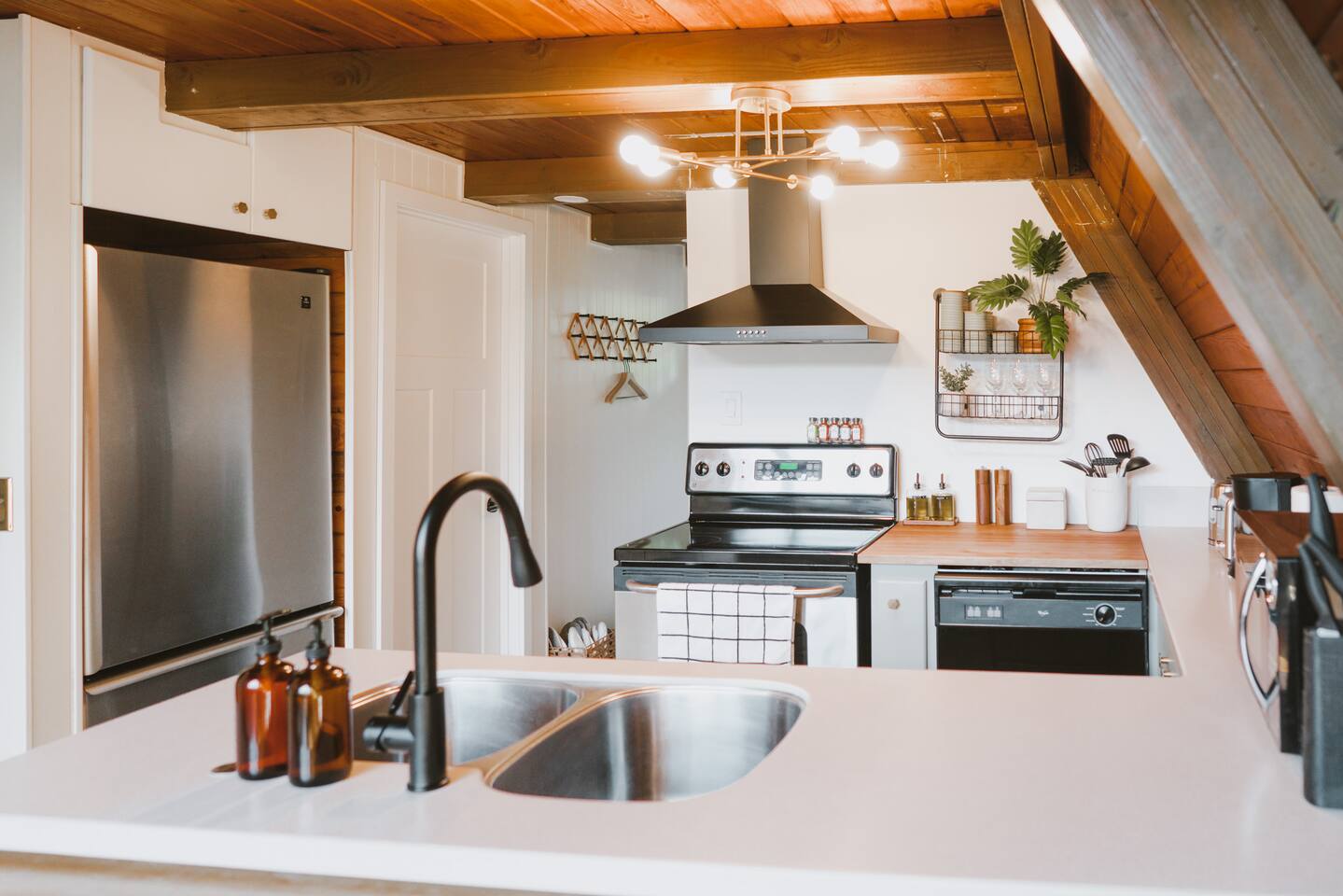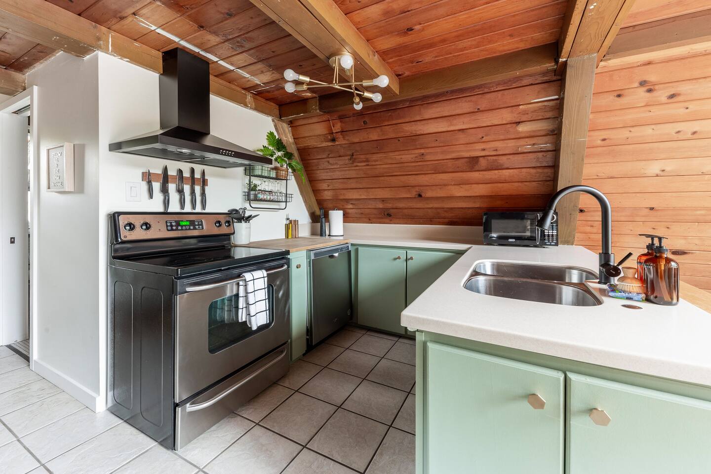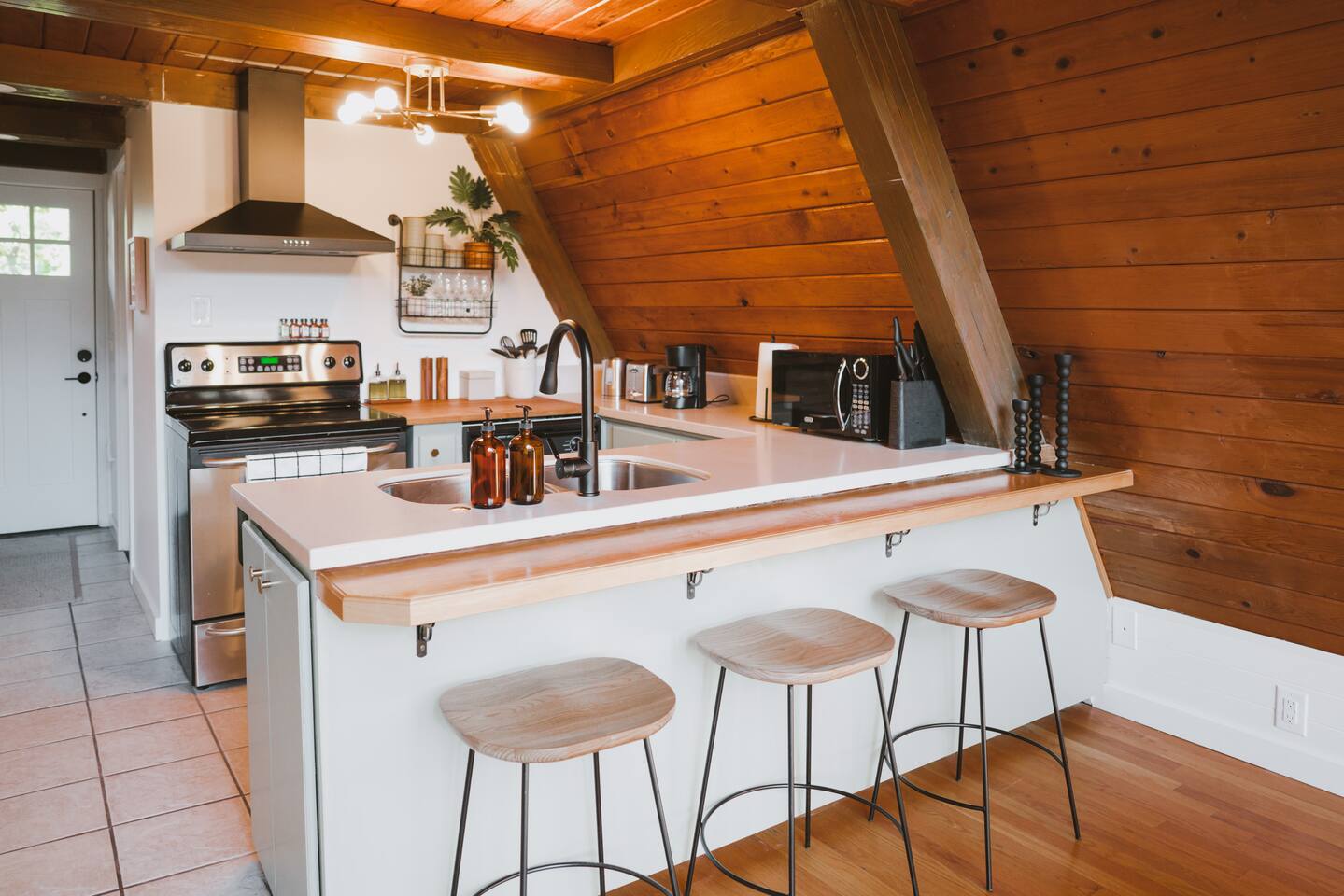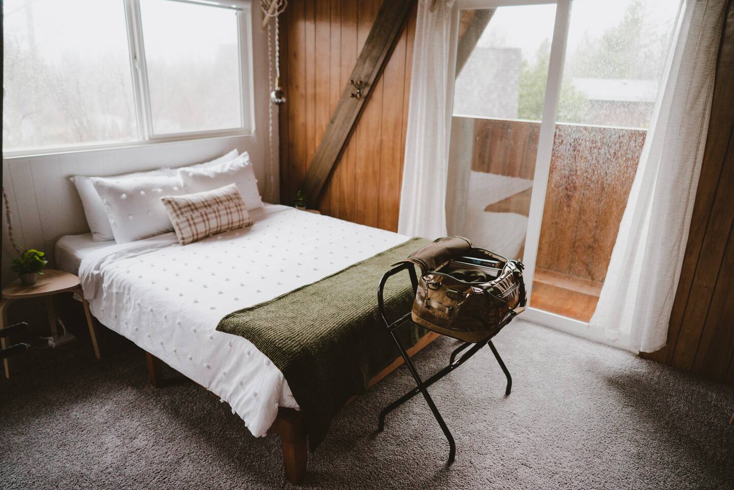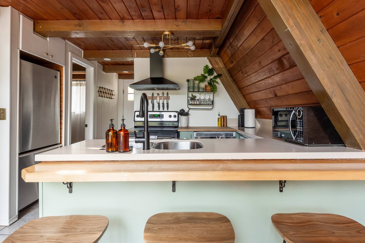 The cabin accommodates up to four adults and features two queen-sized beds, luxurious foam mattresses, and cloud-like duvets. Snuggle up in front of the gas fireplace and stream your favorite movie on the Roku Smart TV, or unwind with your favorite book in the clawfoot tub after an adventure-filled day—your feet will thank you! Finish off the evening with a home-cooked meal in the well-appointed & fully equipped kitchen. If the weather permits, be sure to enjoy a cup of evening tea on the front deck, where you’ll appreciate the abundance of mountain fresh air. The deck comes complete with an outdoor fire pit, well-maintained grill & dining area, surrounded by gorgeous mountains. If staying cozy is more your speed, you’ll be taken care of just the same. Sit back with a glass of mulled wine and soak up the rejuvenation that comes standard with the PNW A-Frame. Watch the light show stream through the windows as the sun catches the mountain peeks at Golden Hour each evening. Don’t feel like cooking? No problem! The cabin is close to several charming restaurants such as Maggy’s Family Mexican and Mountain View Diner. If you’re up for a little friendly competition, you’ll find a foosball table and several board games to keep the whole family entertained. Whether you’ve come for an adventure-packed getaway, or for some much-needed restoration, you’ll be in good hands with the PNW A-Frame.