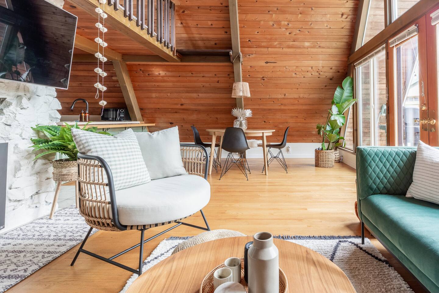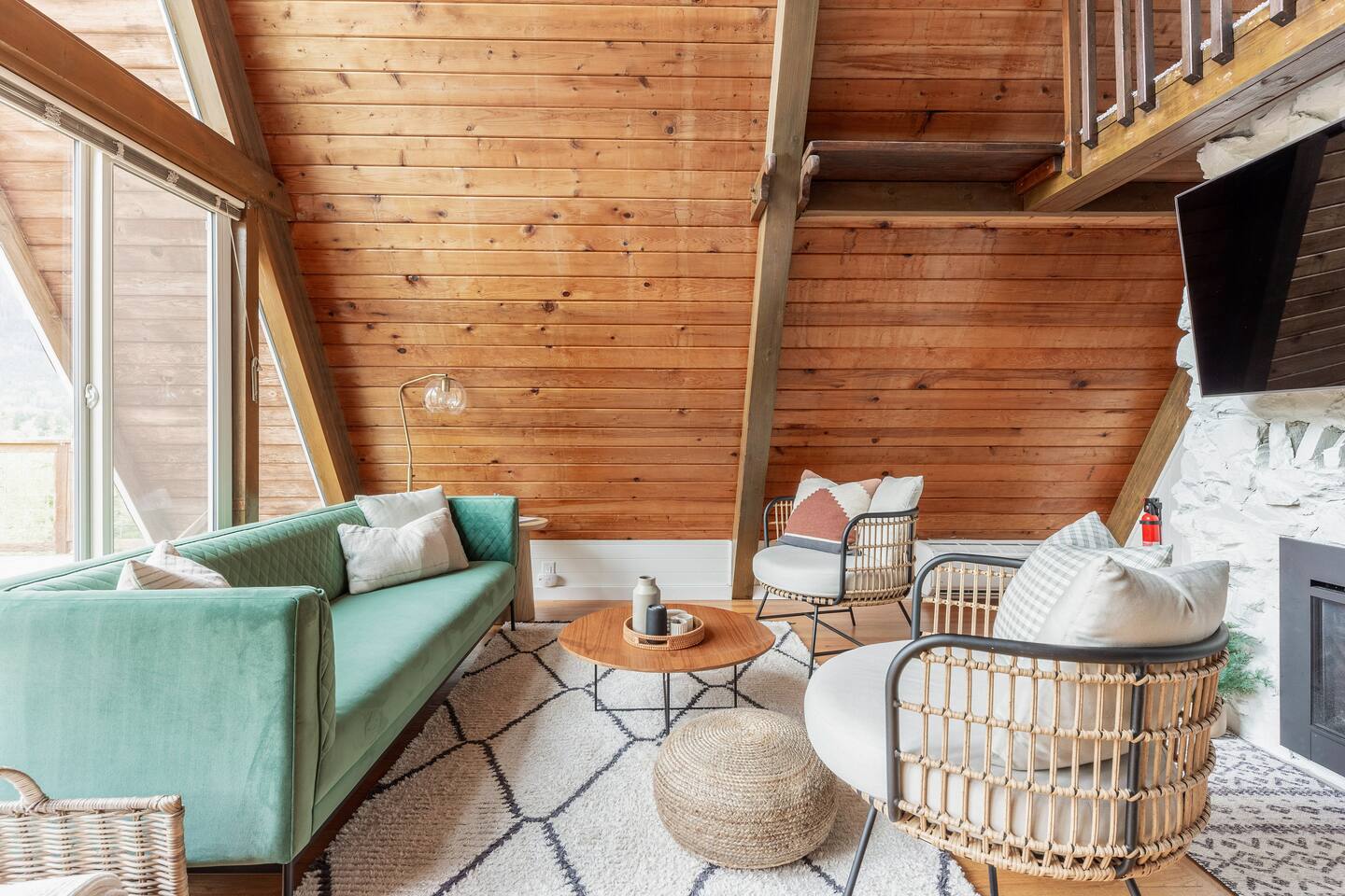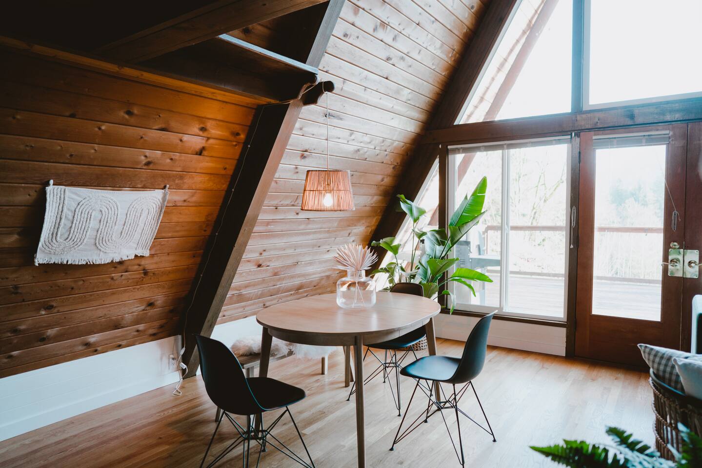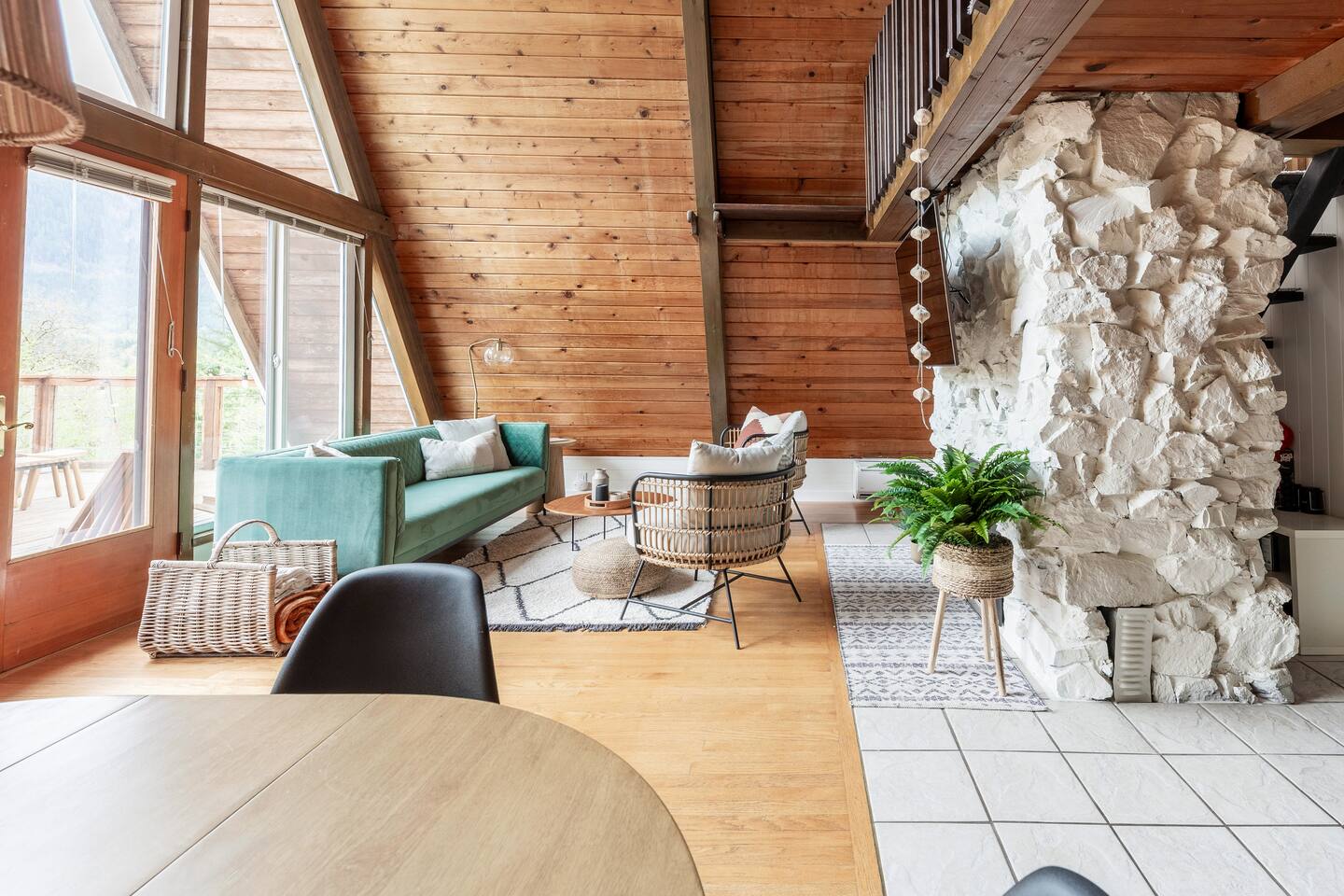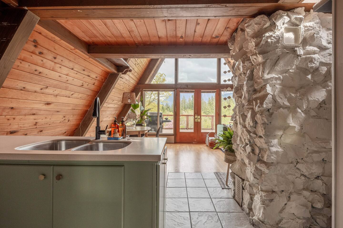 This A-frame cabin is located in a quiet neighborhood. Although occasionally you will hear the train that goes along highway 2 passing by.