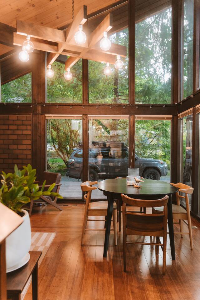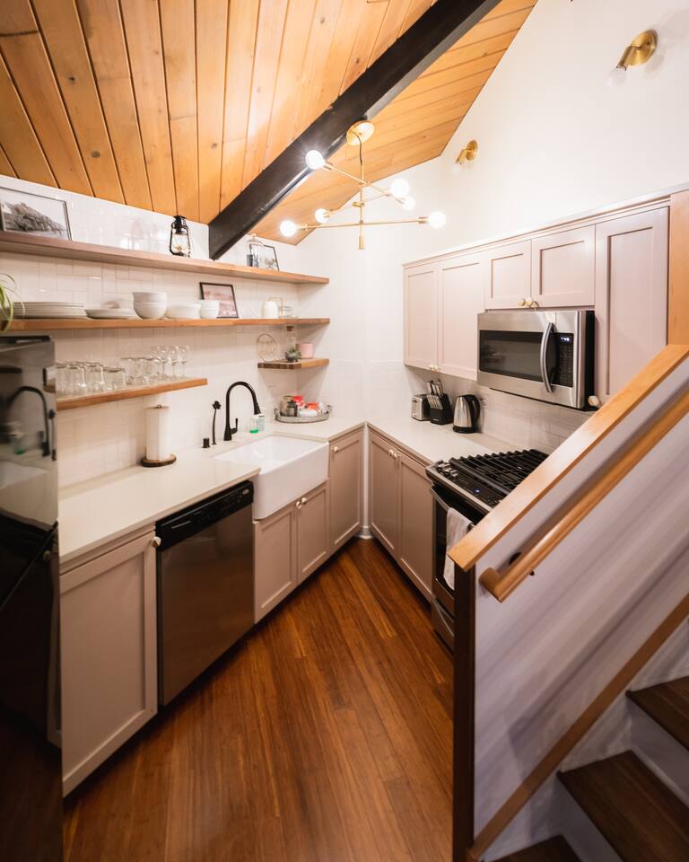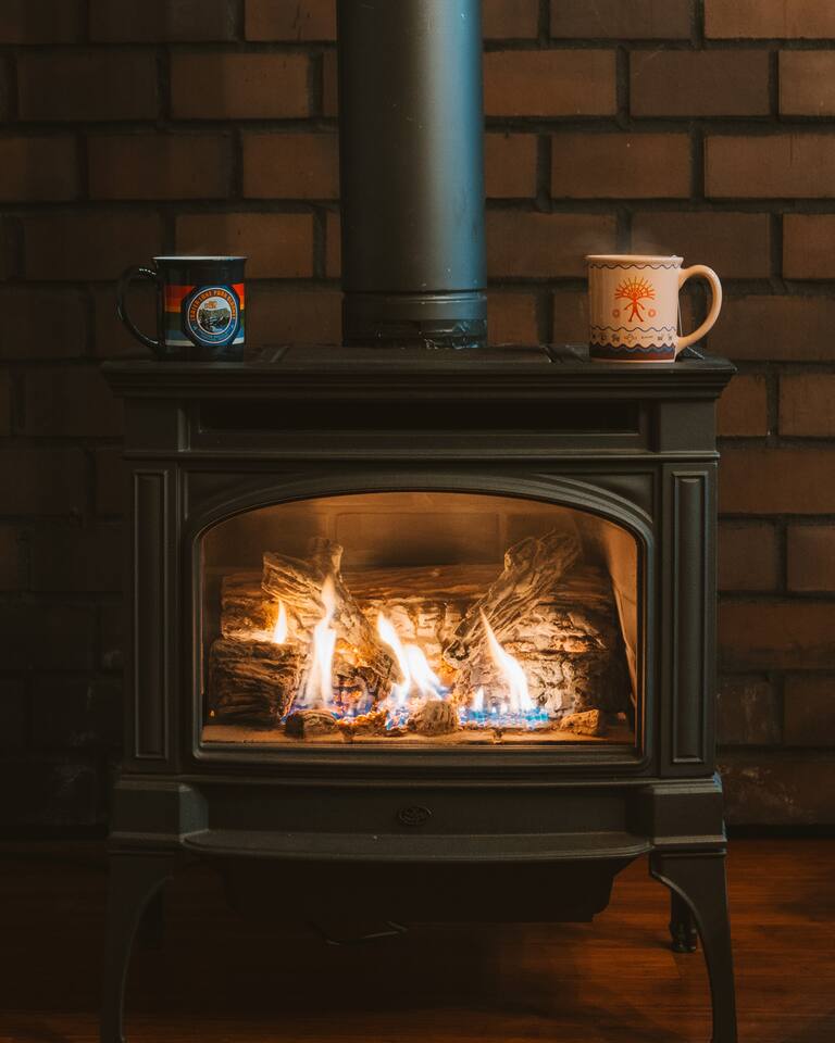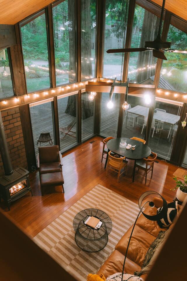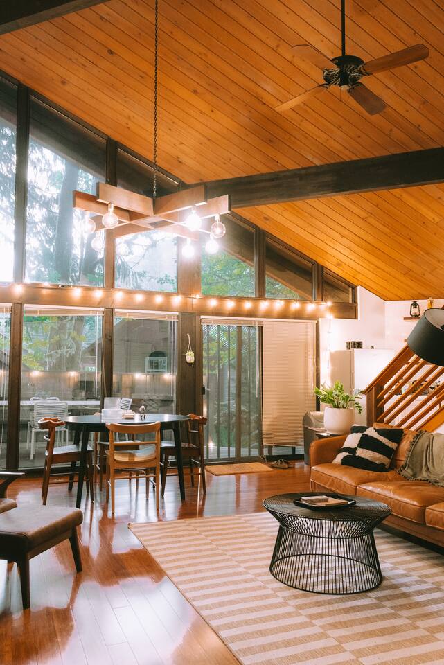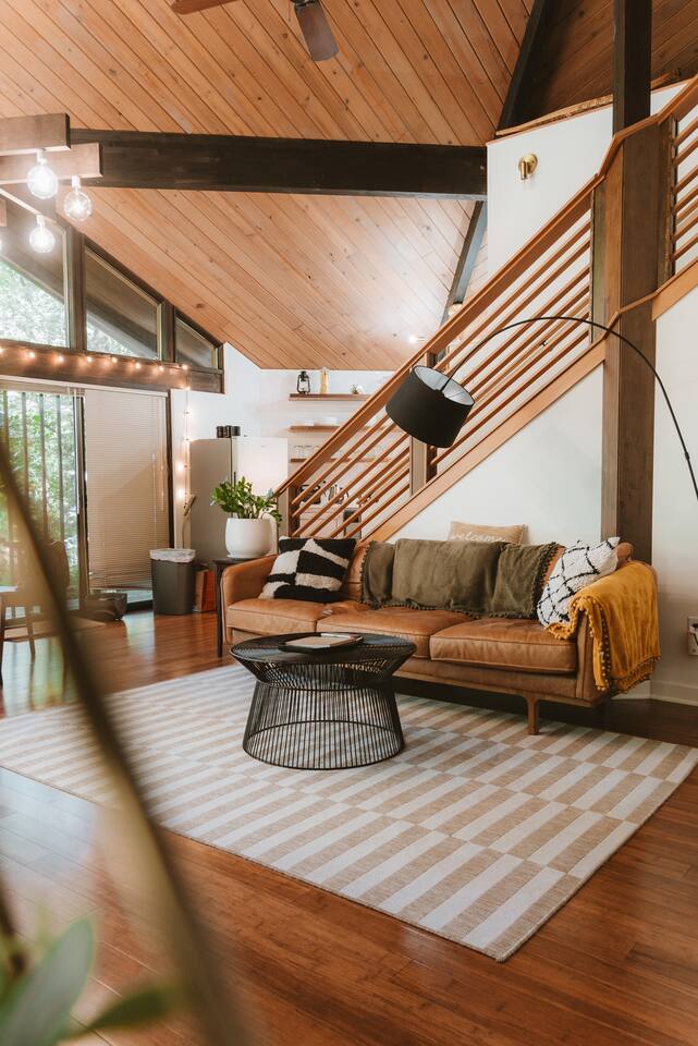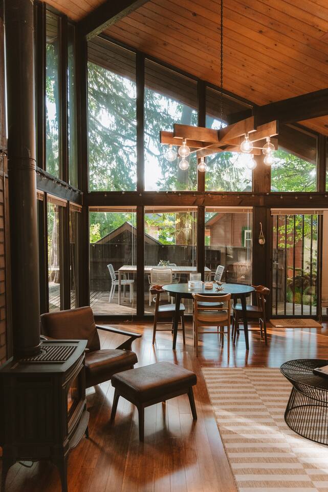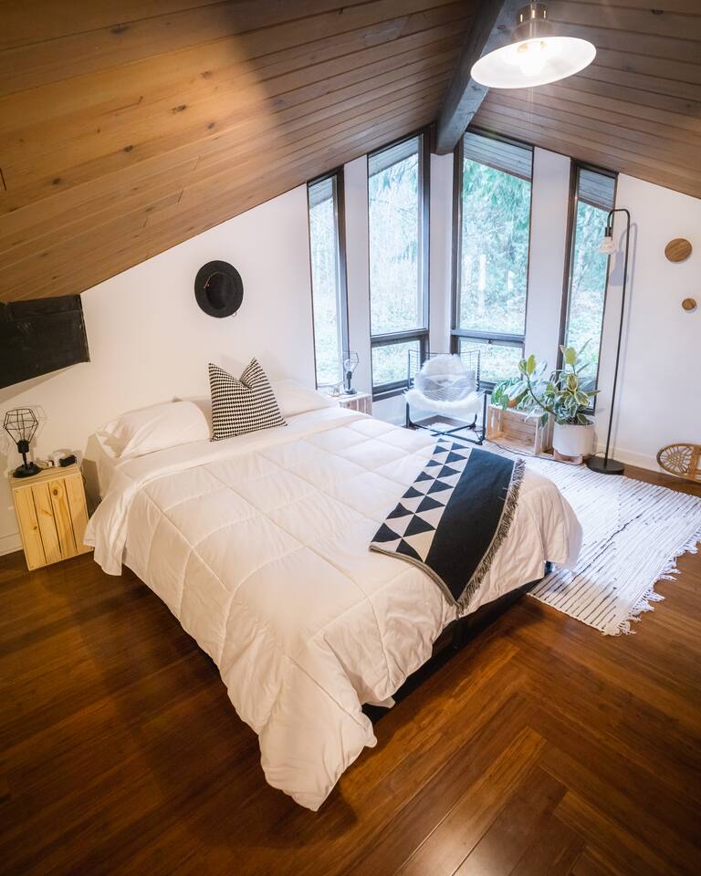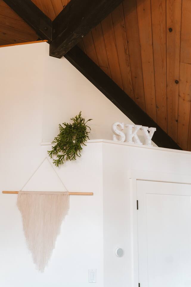 SkyCabin boasts a mid-century style design, dramatic angles, floor-to-ceiling windows & an abundance of natural light - perfect for snapping your next ins-tagram worthy photos! The freshly renovated space comfortably accommodates up to four adults, with two luxuriously outfitted queen-sized beds, perfect to retire in after a full day’s worth of exploration—or relaxing! With a fully-equipped modern kitchen, you can indulge in the full culinary experience, complete with a well-maintained barbeque grill & outdoor seating area. With access to a gas stove, microwave, cookware, dishwasher, chef’s knives & essential cooking items, you can have fun whipping up creative meals from scratch. Upon waking, head downstairs and flip on the cozy gas fireplace while you curl up with a hot cup of jo, or take advantage of the flat-screen TV, where you can stream your favorite shows. From the keyless entry & digital thermostat to the boot dryer & full-sized washer/dryer, the details at SkyCabin will make your stay exceptional.